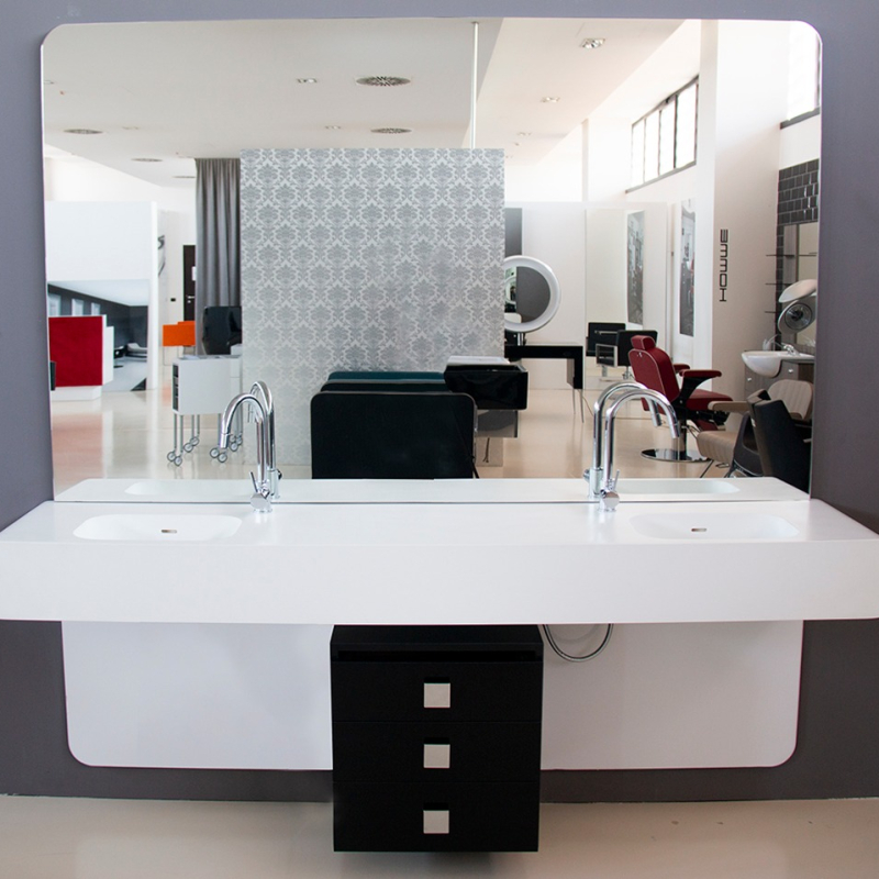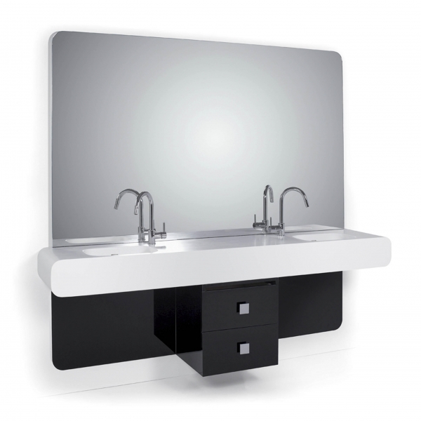 2 Herrenplätze mit Schubladen, Ablage aus Corian mit 2 integrierten Becken.Made in Italy – Hergestellt in Italien.