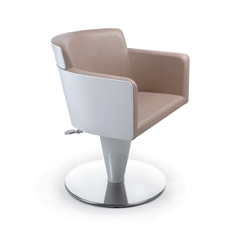 Drehstuhl mit Edelstahlfuß, Hydraulikpumpe und Block. Äußere Struktur aus gebogenem Holz (schwarz oder weiß lackiert oder mit Skai-Vinyl bedeckt). Innenteil aus Schaumspritzguss mit Skai-Vinyl (in verschiedenen Farben erhältlich). Auf die Außenkonstruktion abgestimmte Pumpenabdeckung. Optionen: Struktur in anderen RAL-Farben lackiert.