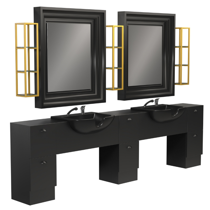 Zwei Plätze Herren Vorwärts Frisierplatz – Laminat in Holzoptik (wood), schwarz oder weiß. Ablage und Regale in durchgefärbtem Laminat in schwarz oder weiß – Keramikbecken. Metalldisplay in Gold oder Schwarz lackiert und Spiegel mit schwarz lackiertem Aluminiumrahmen.