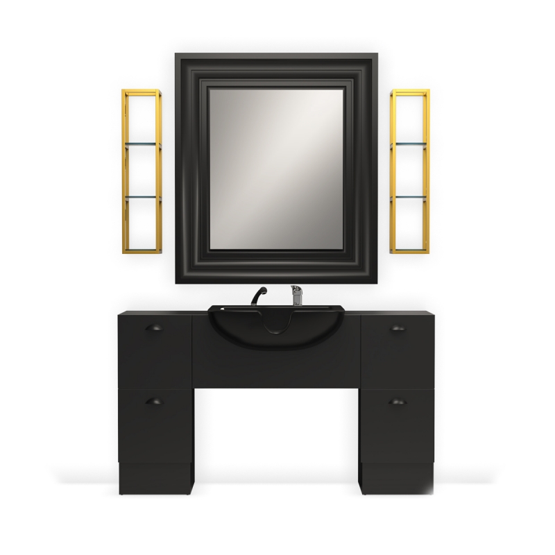 Ein Plätze Herren Vorwärts Frisierplatz – Laminat in Holzoptik (wood), schwarz oder weiß. Ablage und Regale in durchgefärbtem Laminat in schwarz Oder weiß – Keramikbecken. Metalldisplay in Gold oder Schwarz lackiert und Spiegel mit schwarz lackiertem Aluminiumrahmen.