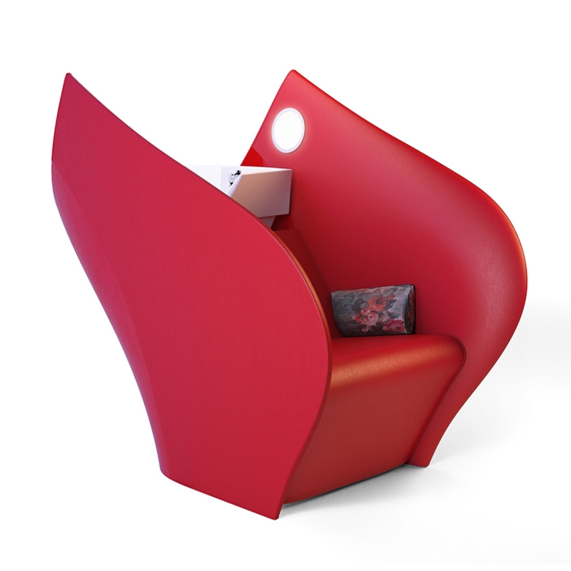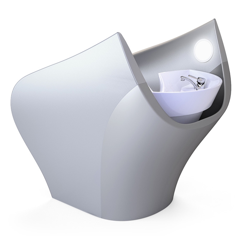 Beauty Flower ist ein Waschplatz mit kippbarem und schiebbarem becken – syncronisierter electrischer rücklehne und beinstütze. Shiatsu-luftmassagesystem, seite mit skai bezogen led-licht, weisse keramik. Rückenrahmen in fiberglasfarbe rot oder schwarz oder grau.