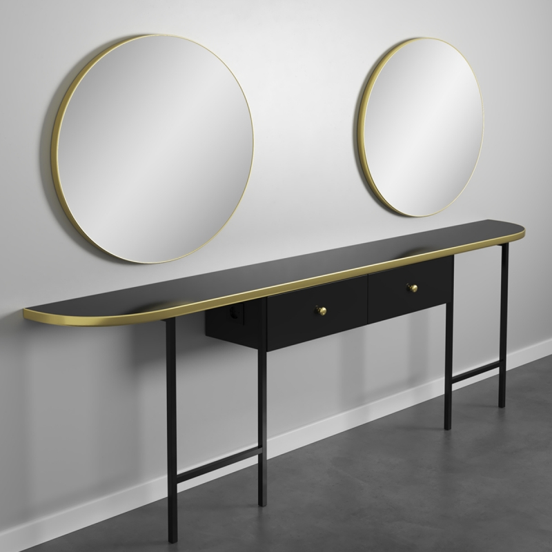 Betelgeuse Wall ist ein Wandarbeitsplatz mit zwei Plätzen. Es hat runde, glänzend schwarze oder goldene Spiegelrahmen und einen schwarzen Metallrahmen mit einer schwarzen Oberseite.