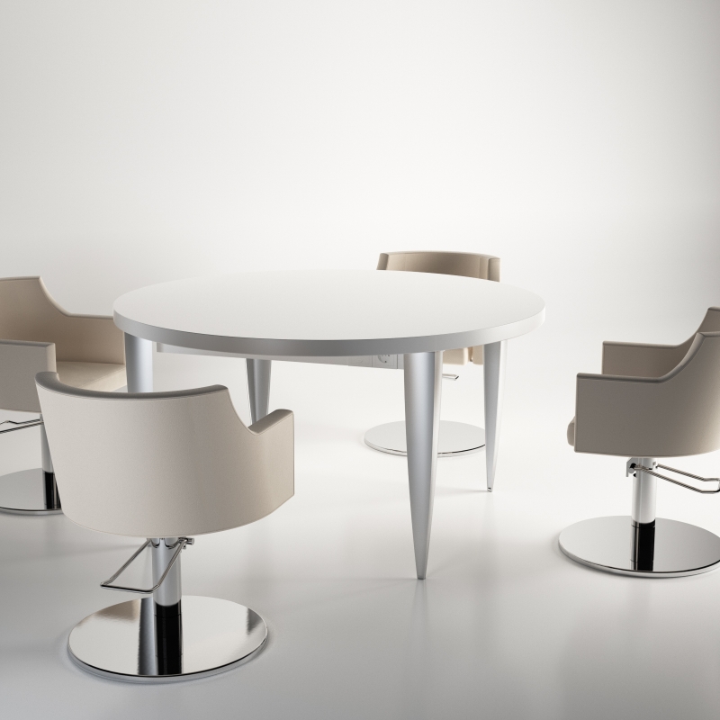 Farberatungstisch mit Aluminiumträger und vier Sitzplätzen. Stühle nicht enthalten. Erhältlich in Acryl, Farben glänzend weiß oder glänzend schwarz.