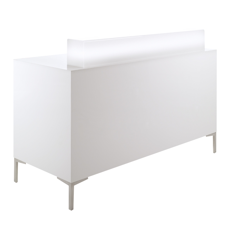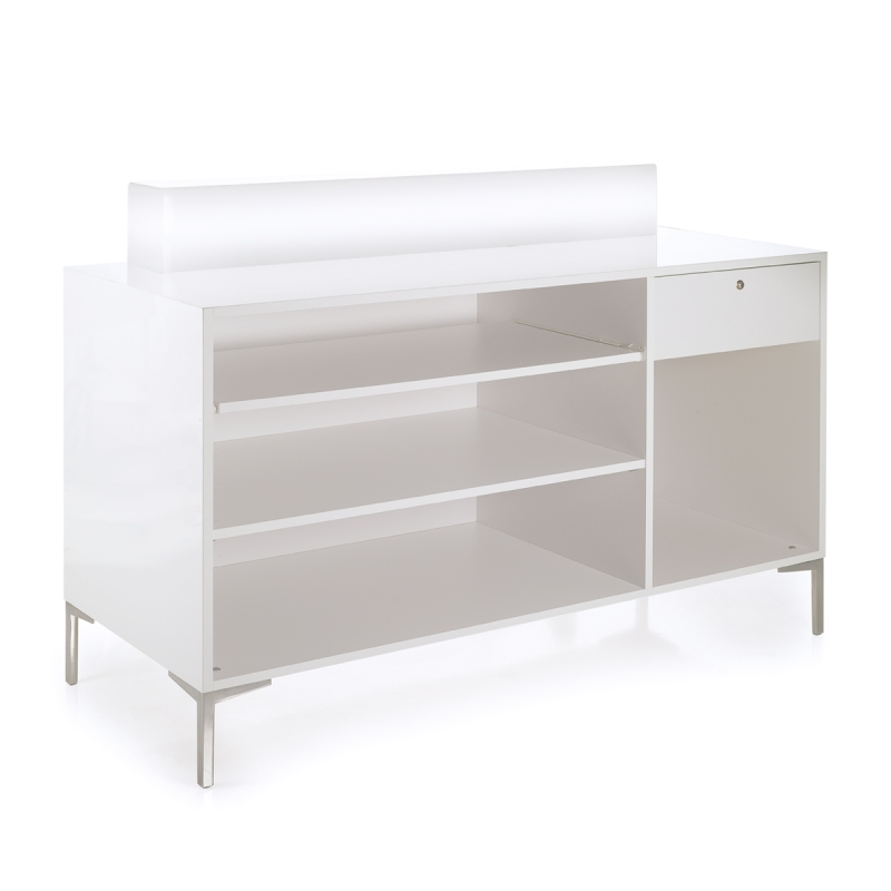 Ecochic ist eine Empfangstheke aus vorgefertigtem Melamin. Schrank mit Regal für Tastatur und Schublade mit Schlüssel.