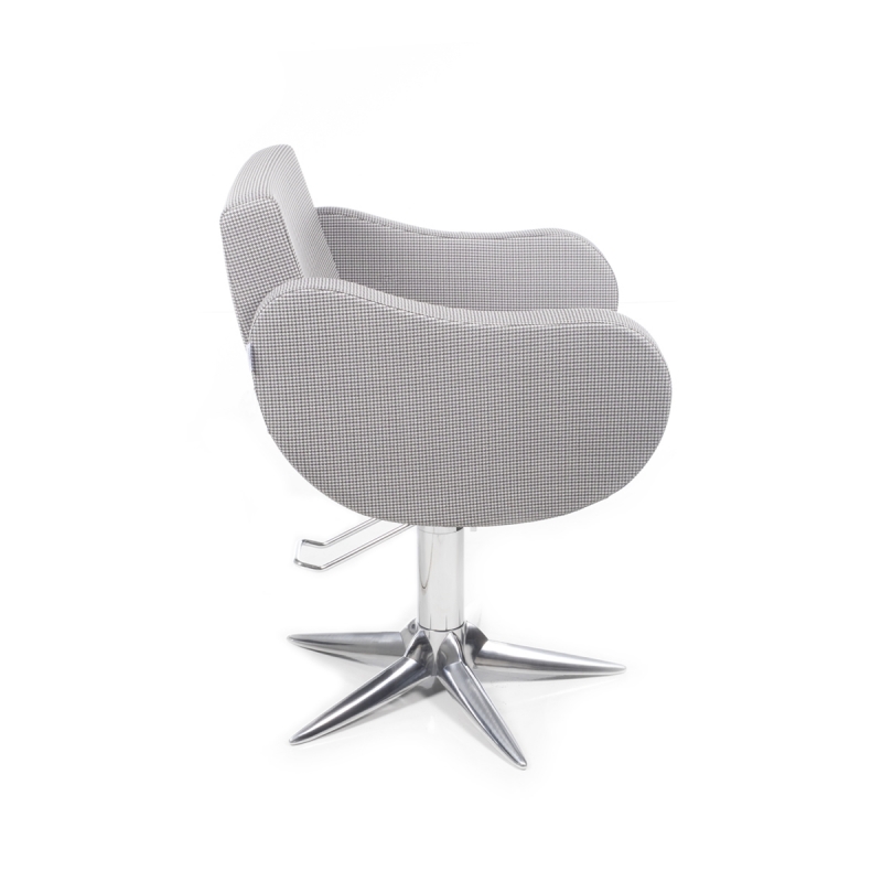 Fifties Parrot ist ein Styling-Salonstuhl mit hydraulisch arretierbarer Pumpe und Parrot-Basis aus Aluminium. Alle Skai-Farben erhältlich.