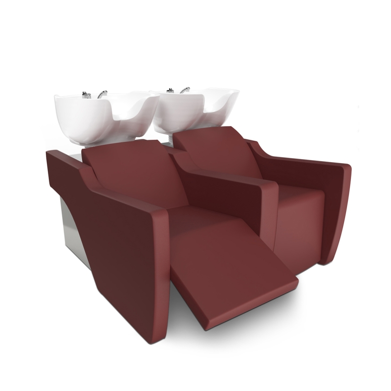 Zwei-sitzer kompakt waschplatz mit kippwanne, sessel „half-lying position“, mit einem komfortablen rückwärtigen stauraum für produkte und handtücher, mit elektrischer beinstütze und shiatsu air-massage system.