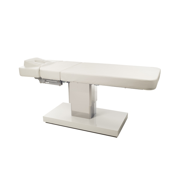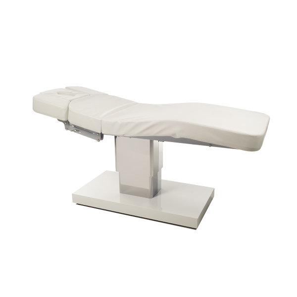 Massageliege SPA Bed für Körper- und Gesichtsbehandlungen, ausgestattet mit drei Motoren für elektrische Höhenverstellung, Rücken- und Beinauflage, justierbare Armauflagen und Kopfstütze mit Aussparung für das Gesicht.