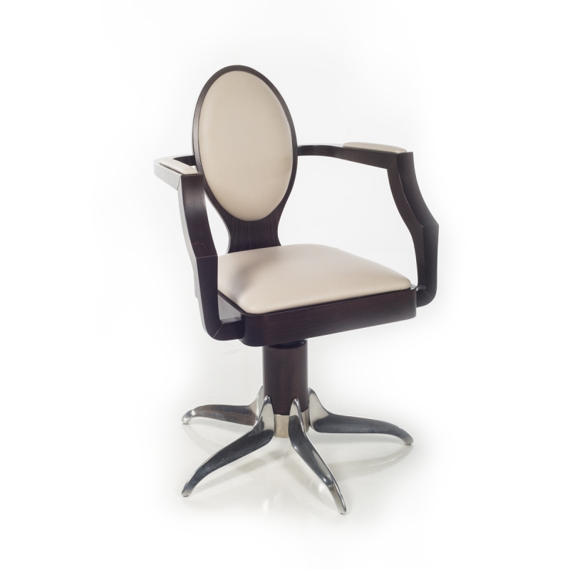 Drehbarer Friseurstuhl ohne Untergestell. Struktur aus poliertem Buchenholz, mit Kissen, die mit Skai bezogen sind. Alle Skai-Farben erhältlich.