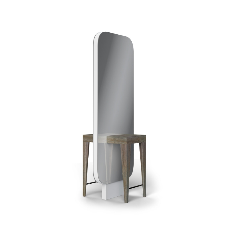 Doppelte Frisierstation, elektrifizierter Konsolenschrank in Holzausführung oder schwarzer oder weißer Acrylausführung.