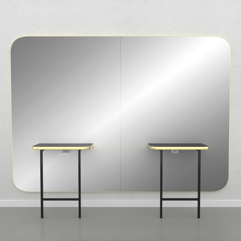 Wandstation mit zwei Plätzen Rahmen in glänzendem Schwarz oder Gold. Schwarze Metallstruktur mit schwarzer Oberseite.