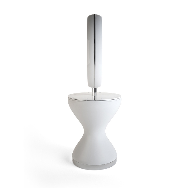 Freistehender Doppel-Bedienplatz, Struktur weiß lackiert, runder Spiegel mit weißem LED-hinterleuchtetem lackiertem Rahmen, Top Colorpack, mit 2 Stauraum-Fächern mit Steckdosen,