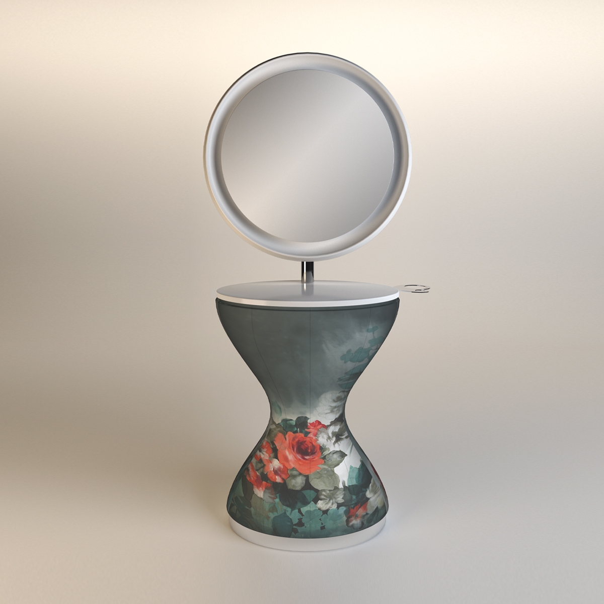 Freistehender Einzel-Bedienplatz, mit austauschbarem Stoffbezug, runder Spiegel mit weißem LED-hinterleuchtetem lackiertem Rahmen, Top Acryl und einziehbarem Fönhalter. Miss Beauty in den Versionen Grey, Green und Bloom.