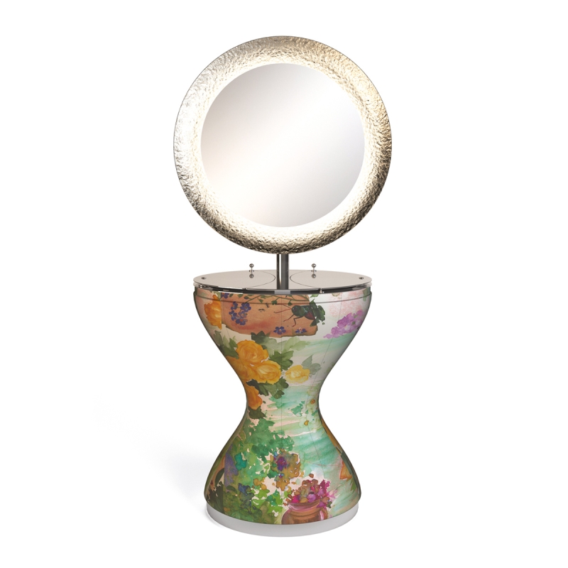 Freistehender Einzel-Bedienplatz, mit austauschbarem Stoffbezug, runder Spiegel, konkav geformter Rahmen mit Blattsilber belegt, mit indirekter LED-Beleuchtung, Top Inox, mit 2 Stauraum-Fächern mit Steckdosen USB-Anschluss und einziehbarem Fönhalter. Miss Beauty in den Versionen Grey, Green und Bloom.