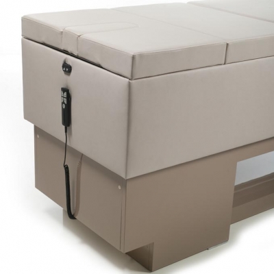 Waschtisch und Becken aus Edelstahl mit elektrisch verstellbarem Massagebett mit Fernbedienung.