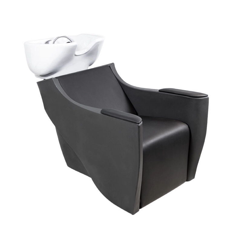 Waschanlage mit kippbarem Becken und dunkelgrauer Kunststoffstruktur mit gepolsterten Armlehnen.
