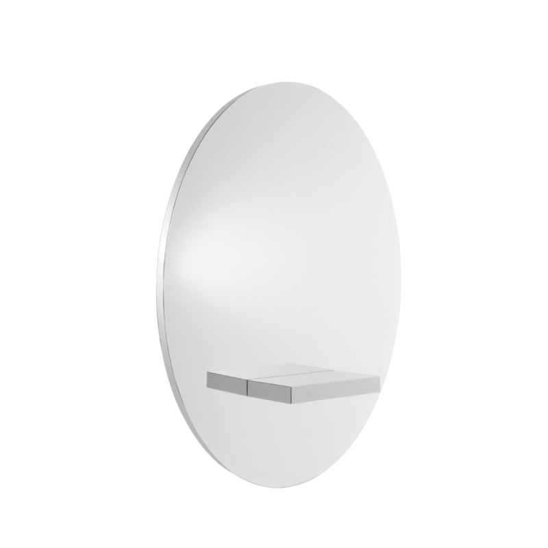 Wandfrisierplatz in ovaler Form, ein Sitze. Ablage mit integrierten Steckdosen aus Edelstahl.