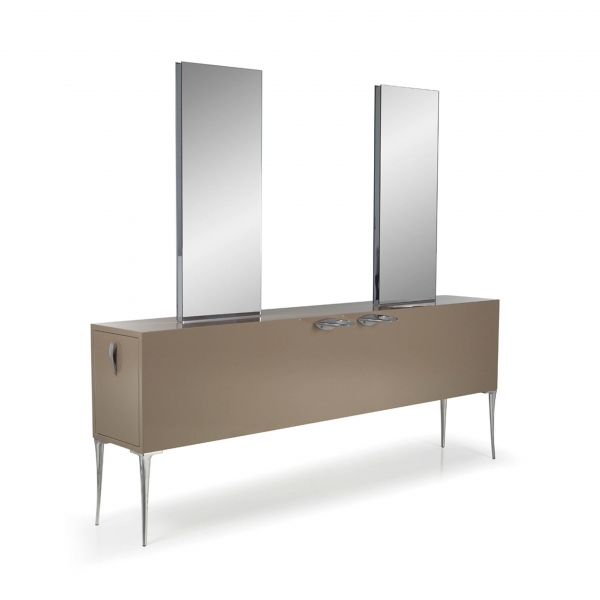 Die Platte ist aus lackierter Buche oder Laminat mit zwei Schubladen. Es wird mit vier rechteckigen Spiegeln auf silbernen Laminatplatten geliefert. Es hat einen Handtuchhalter und Beine aus poliertem Aluminium. Der zentrale Kabelkasten besteht aus Edelstahl.