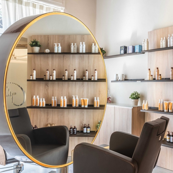 Zentrale Frisierstation mit zwei Sitzplätzen.