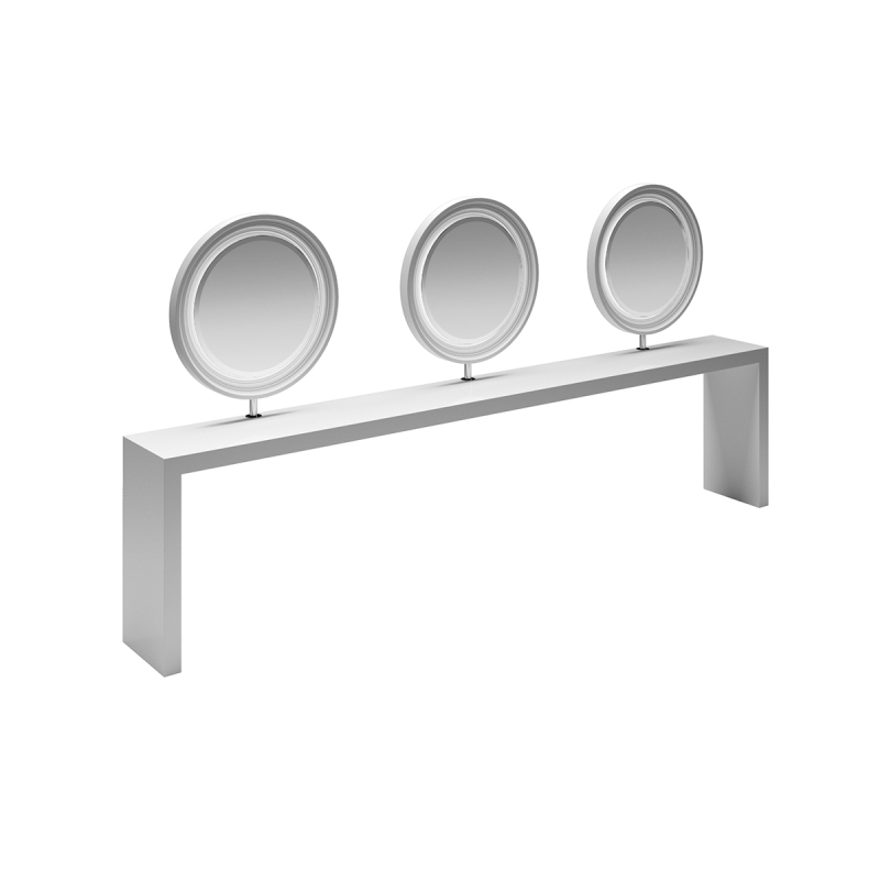 Wandmontierter Dreisitzer-Arbeitsplatz mit glänzend weißer oder schwarzer Oberfläche.