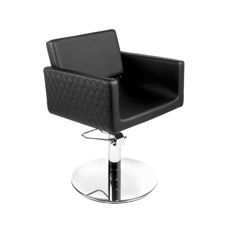 Frisierstuhl mit hydraulisch arretierbarer Pumpe und Roto-Basis. Schwarze Skai-Farbe mit QUILT-Dekoration.
